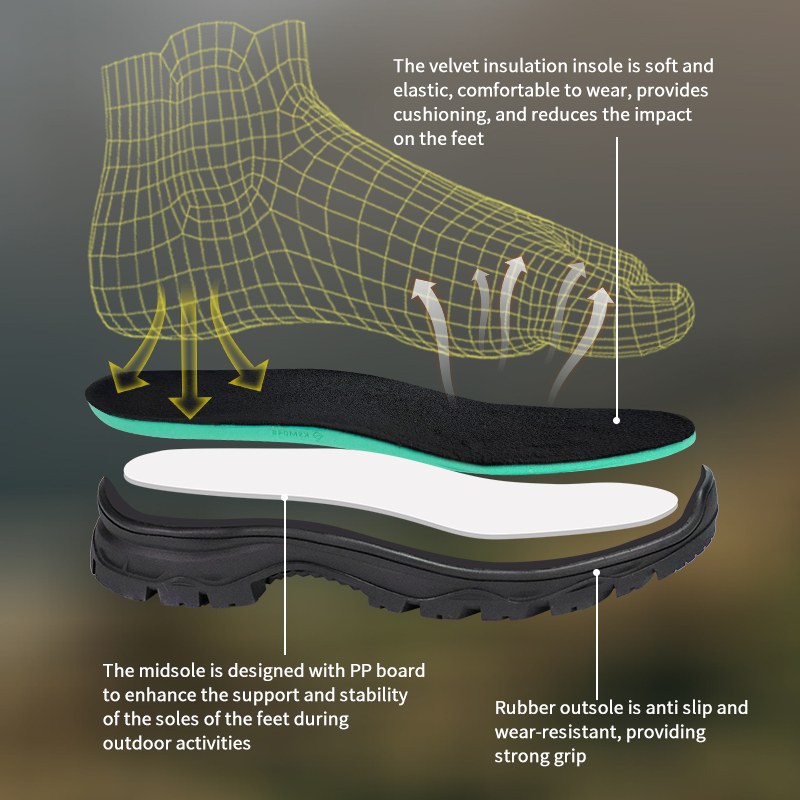 ①Zamatová podšívka. Mäkké pod nohami. Pohlcuje dopad. ②PP medzipodrážka pre stabilnú podporu. ③Gumová podrážka, ktorá nepustí. Priľne, vydrží, zostáva spoľahlivý.