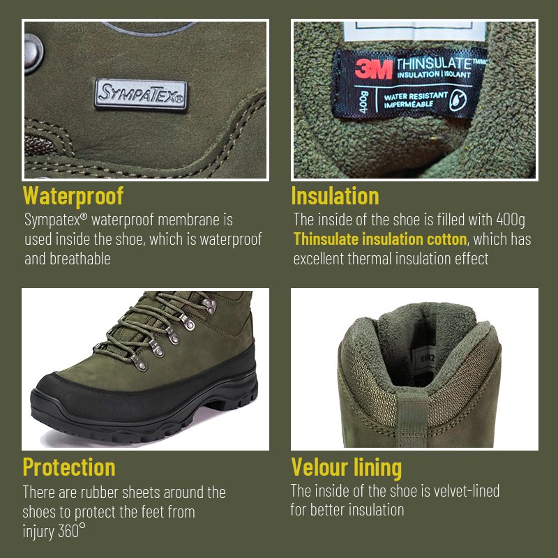 Tieto poľovnícke topánky Sympatex Waterproof Insulation Thinsulate sú k dispozícii na prispôsobenie farieb, materiálov a detailov, s MOQ 800 párov, ideálne pre spoluprácu so značkou a skupinové obstarávanie. A tieto lovecké topánky majú nasledujúce výhody: